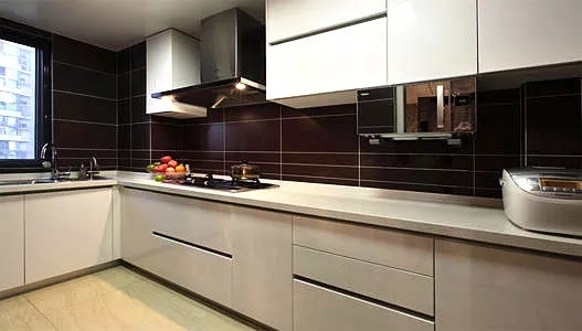 U型厨房是L型厨房的空间延伸,即在L的长边对面加上一个柜面,呈包围式分布。这种布局扩大了操作面积,可供二人同时在厨房操作。U型厨房会出现的两处盲角,在厨房面积没有很大的情况下,可以遵循黄金三角工作区。清洗区域放置在U型底部,同时把配菜区和烹饪区设在两旁,形成一个三角形,增强工作的流畅性。设计U型厨房橱柜时候,不要忽略冰箱的位置,可以把冰箱嵌入橱柜内,整体和家具融合让为一体,更富有的美观性。冰箱、水槽、灶台三者操作的连贯性会直接影响食材处理效率,冰箱离厨房近,可以大大的节省食材拿取的时间成本。